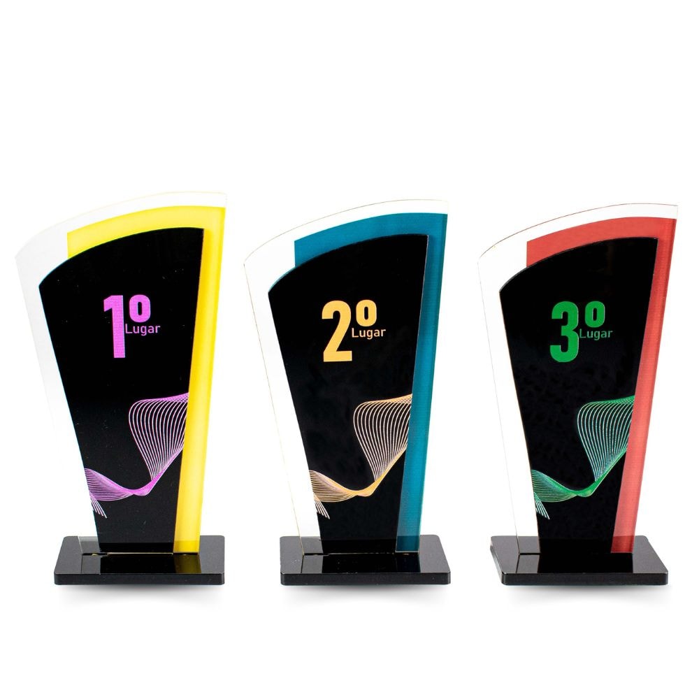Destaque o sucesso de seus eventos com nossos conjuntos de troféus em acrílico para 1º, 2º e 3º lugar. Com um design moderno e elegante, esses troféus são feitos em acrílico de alta qualidade e contam com impressão digital nítida e vibrante. Eles são perfeitos para premiações em competições, eventos corporativos ou escolares, oferecendo uma alternativa sofisticada e duradoura.