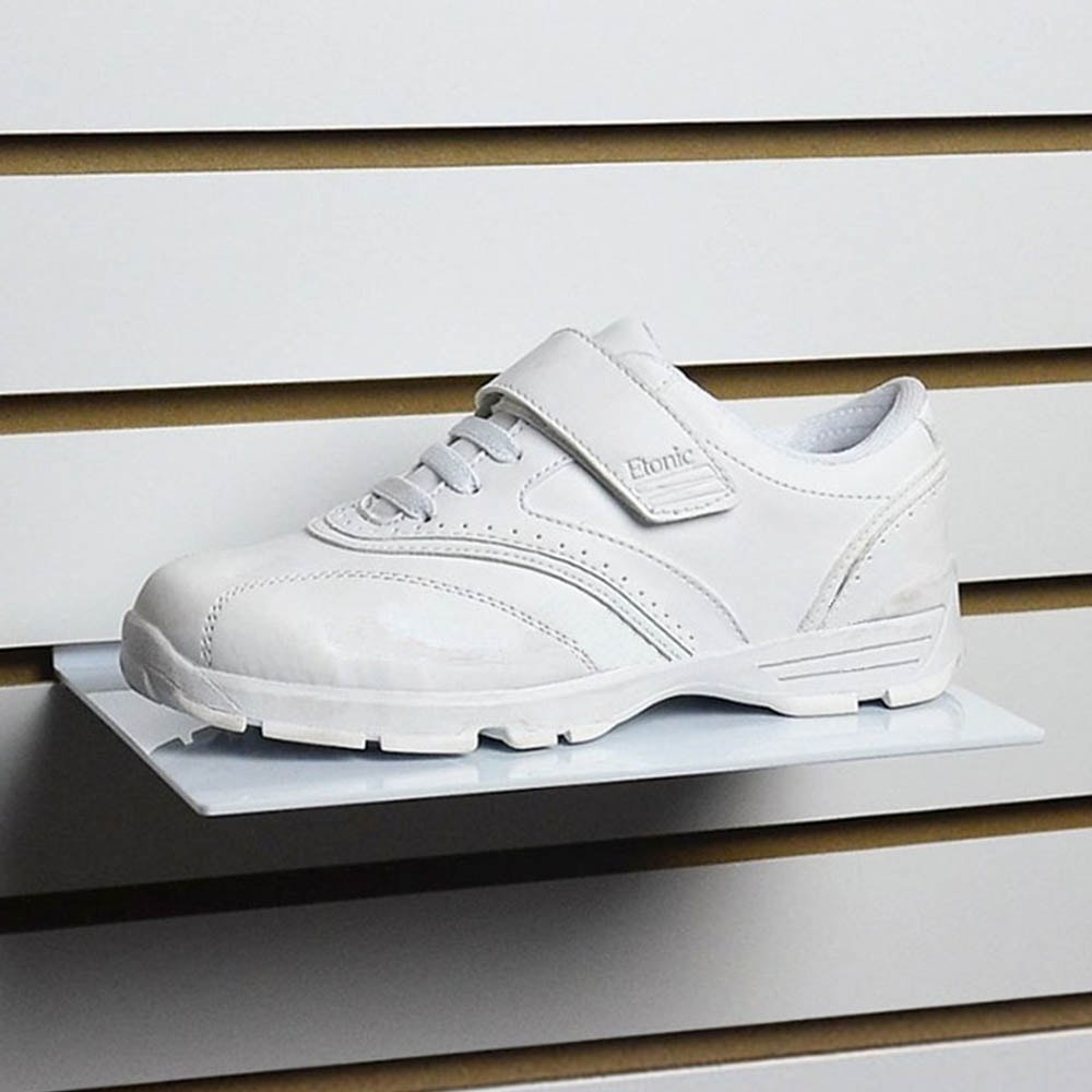 Expositor de calçados fabricado em acrílico branco. Este modelo é para encaixar em painéis canaletados/inteligentes. As peças servem para a exposição de diversos modelos como tênis, botas ou sandálias.