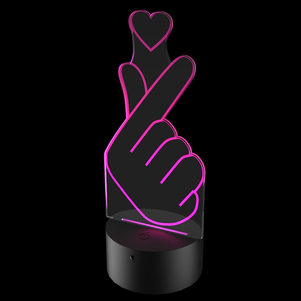 Luminária de LED do símbolo famoso entre os fãs da banda BTS, o coraçãozinho formado com os dedos. A luminária possui 16 cores de iluminação que são alternadas pelo controle remoto ou também pelo touch na base.