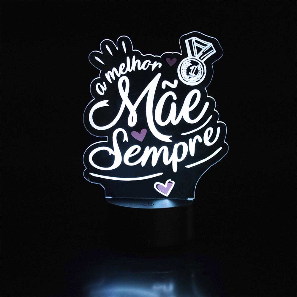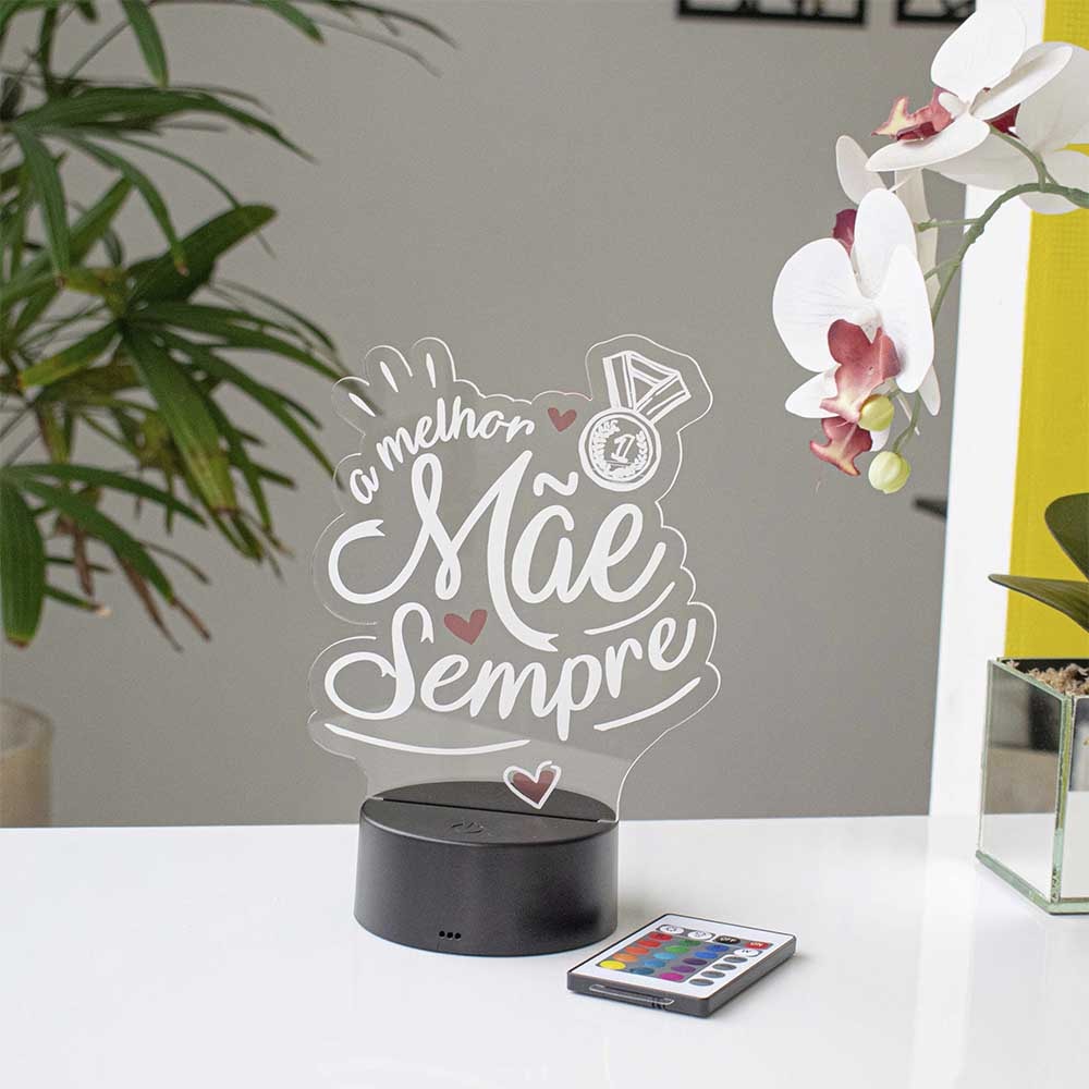 A Luminária de Led - Melhor Mãe projetada em acrílico cristal foi pensada para você que quer presentear uma pessoa especial em sua vida de uma forma única! Ela possui 16 variações de cores, acompanha base com controle remoto e cabo USB, além de também poder ser utilizada com pilhas e fonte bivolt.