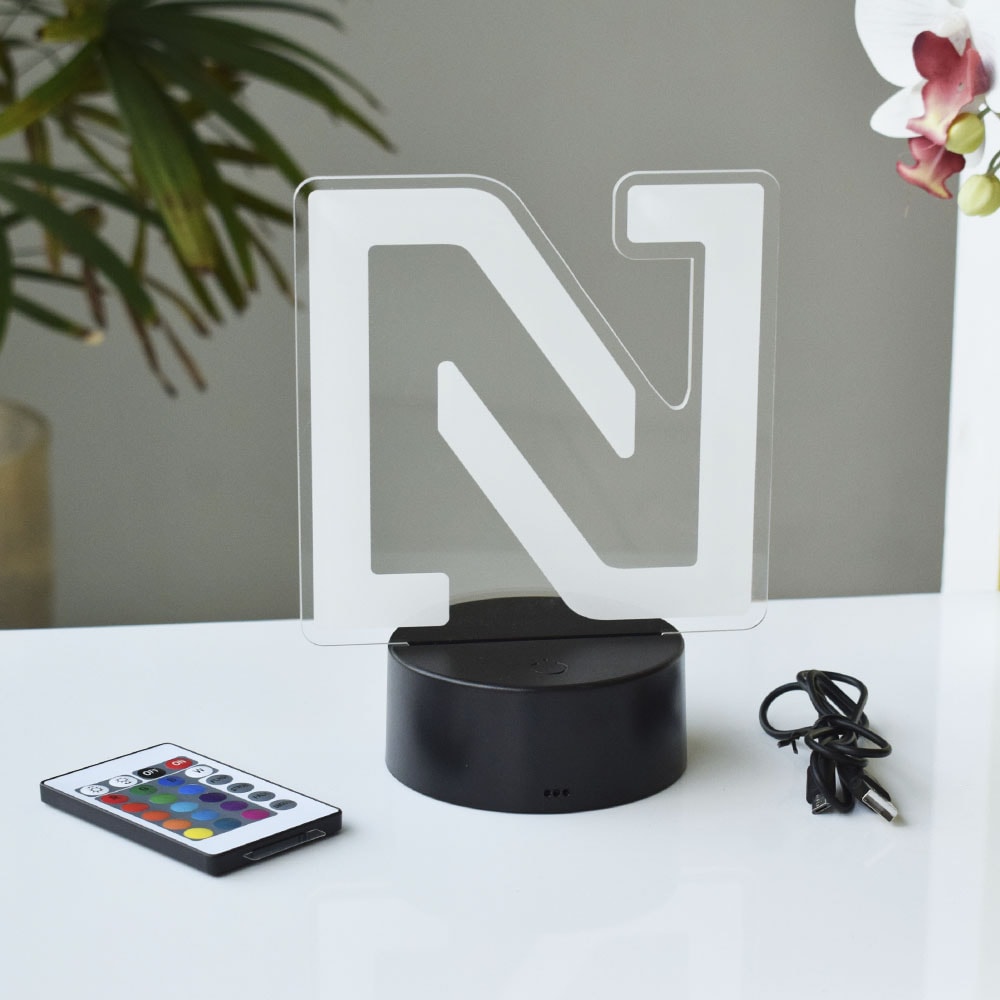 Fabricada em acrílico cristal 4mm com personalização da sua marca gravado a laser. A luminária conta com uma base que contém 16 diferentes cores na sua iluminação, controle de intensidade da cor e 4 efeitos diferentes. Também pode ser usada com fonte bivolt e com pilhas (não acompanham o produto).