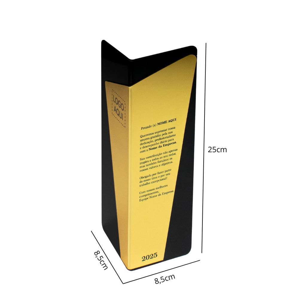 Transforme momentos de reconhecimento em algo verdadeiramente especial! Este troféu em acrílico, com design moderno e linhas sofisticadas, é perfeito para homenagear conquistas em eventos corporativos, premiações ou celebrações únicas. Possui duas variações em ABS na cor prata e/ou dourada.