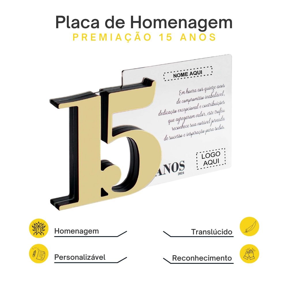 Criada para celebrar conquistas especiais, a Placa de Homenagem de 15 Anos vai além de um simples item: é uma lembrança duradoura da admiração e respeito. Com números indicativos de anos disponíveis em prata, azul, vermelho ou dourado, e fabricada em acrílico resistente, essa placa oferece a opção de personalizar o nome e a logo, tornando a homenagem ainda mais significativa.